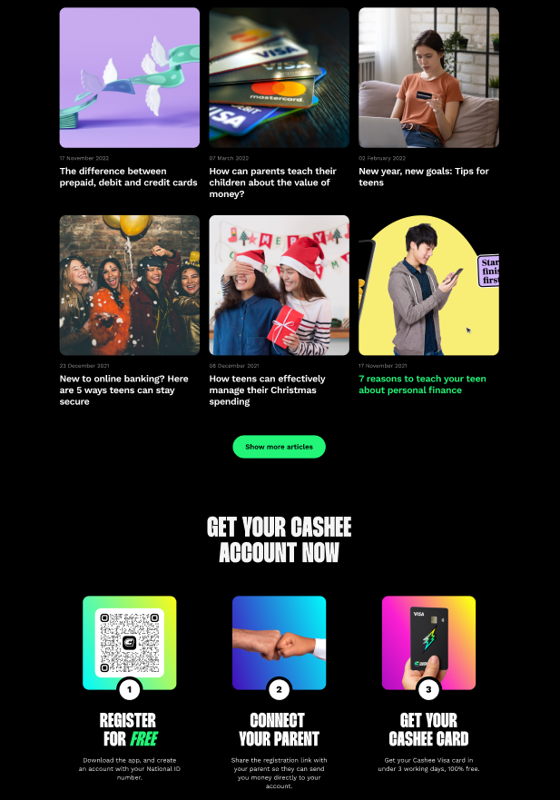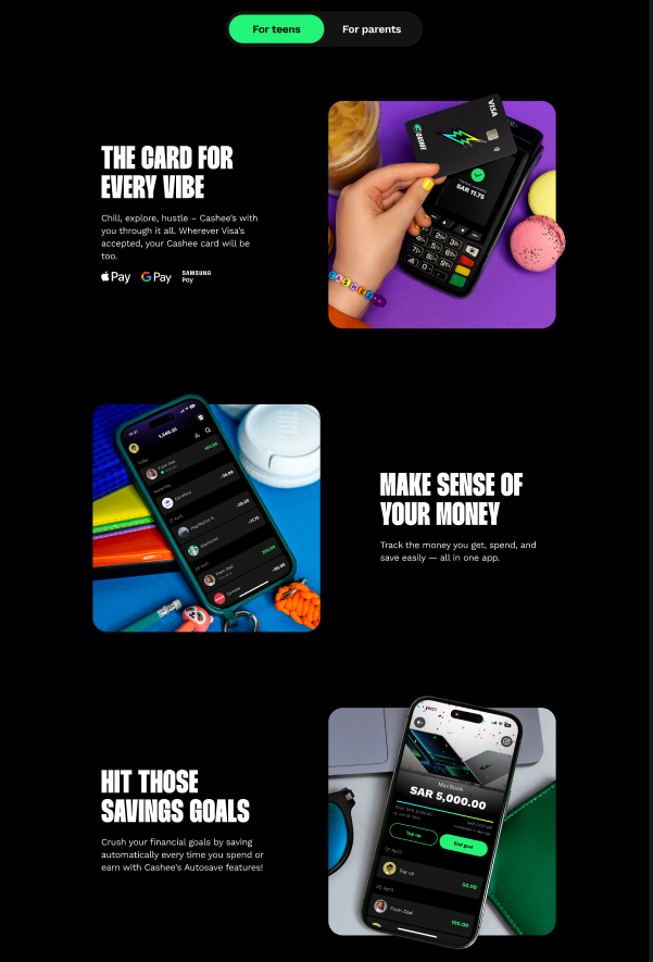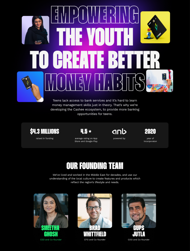 Cashee is a digital banking and financial education platform for teens in the United Arab Emirates. Cashee aims to empower teens to make their own financial decisions and learn about money management through an engaging experience and through Cashee’s ed-tech content coming up in the near future.